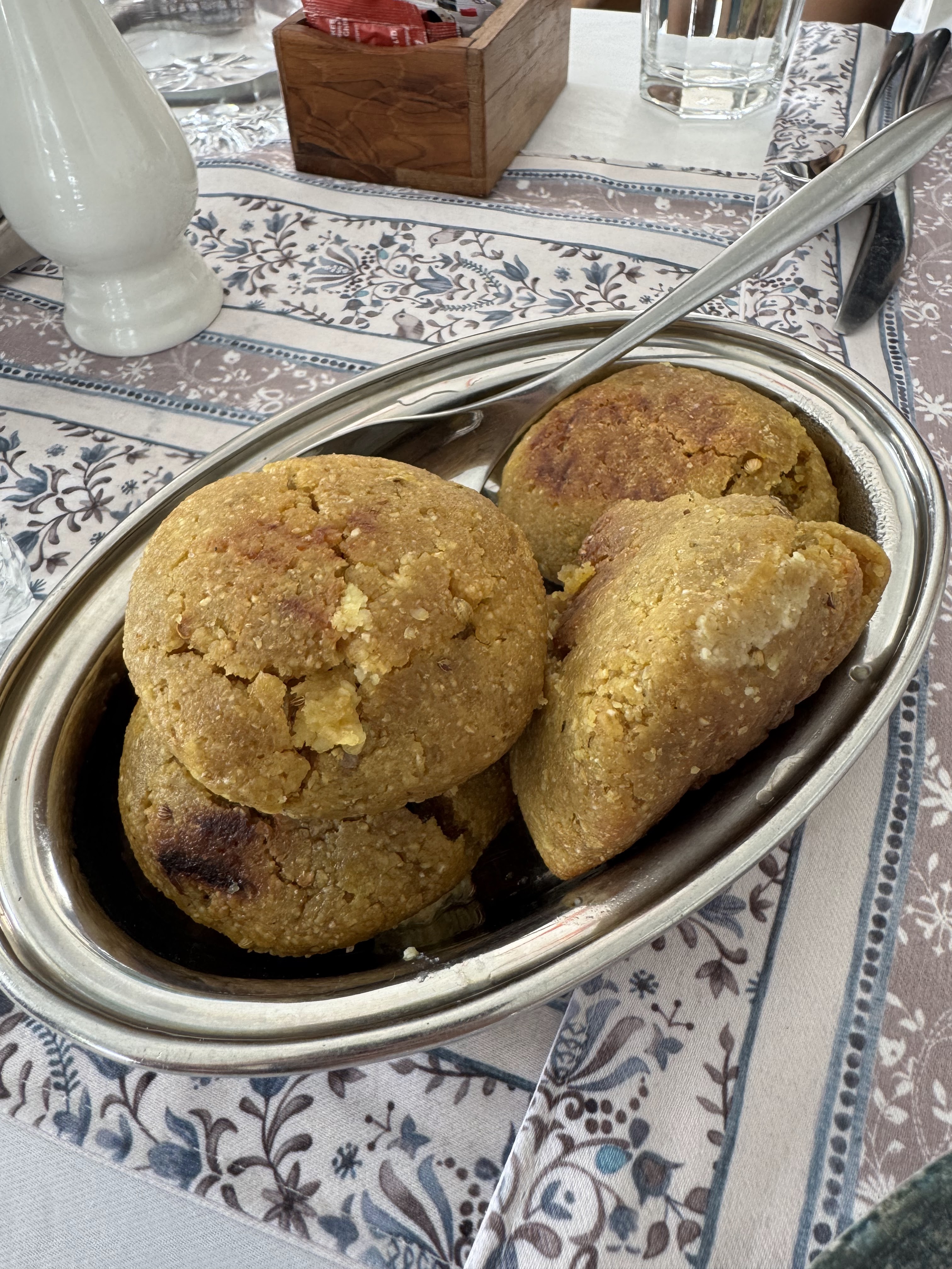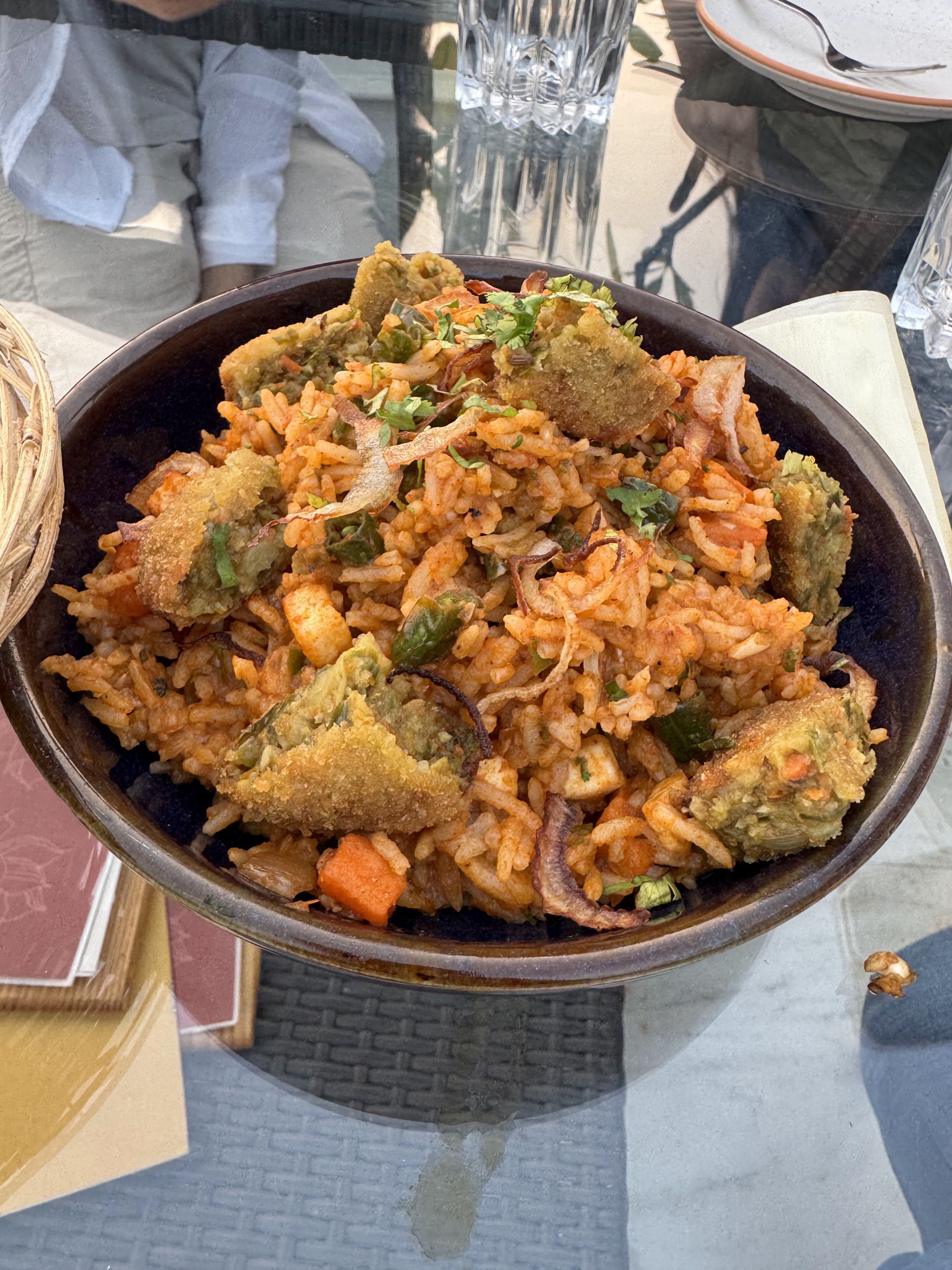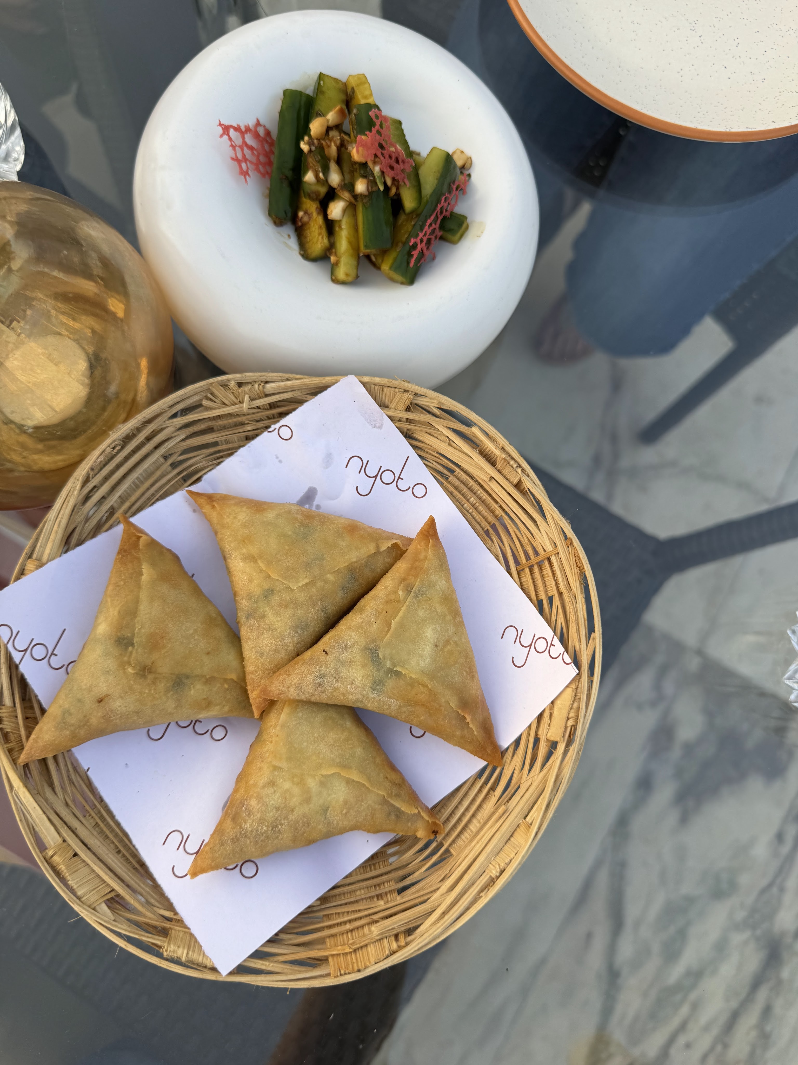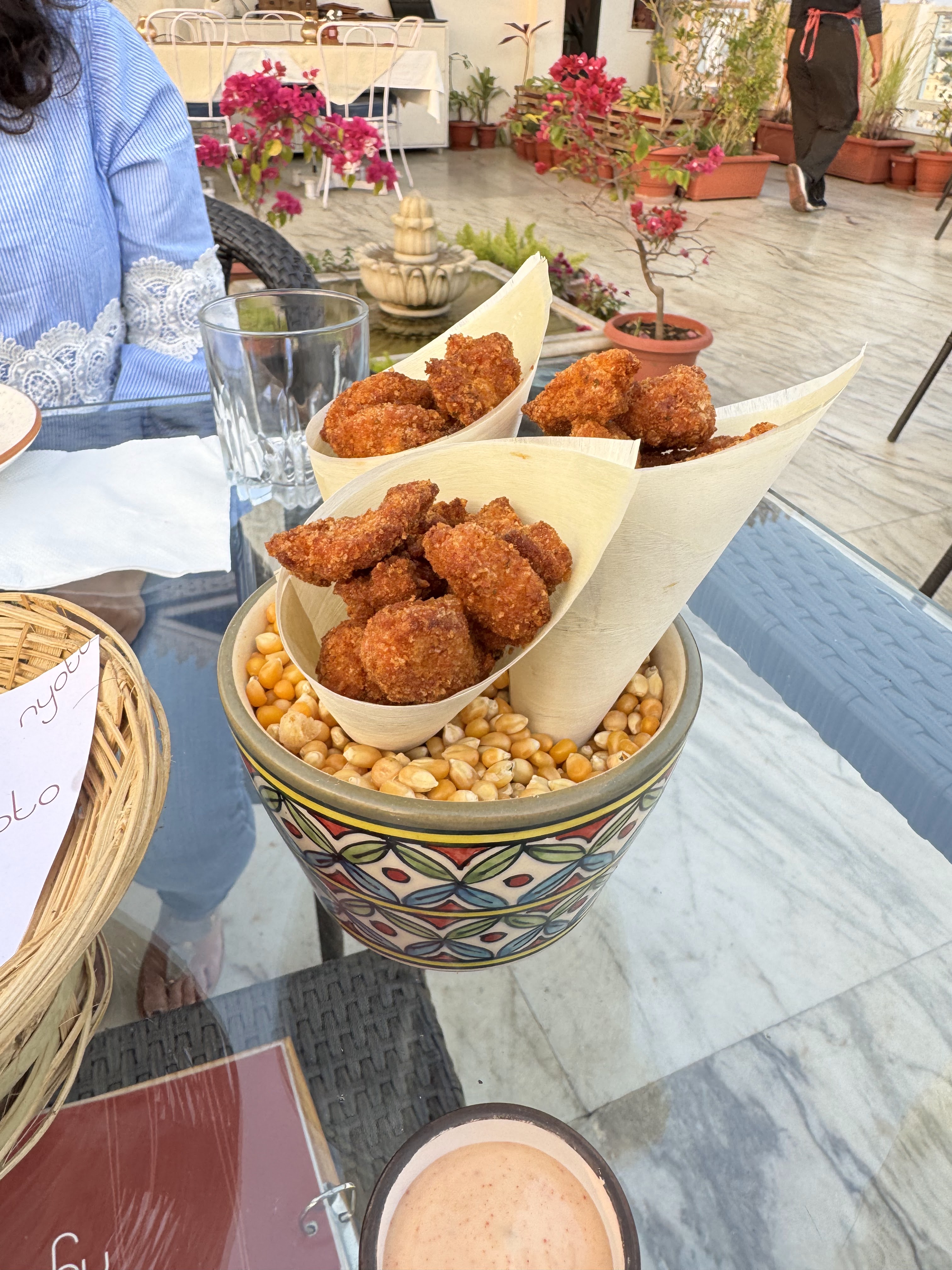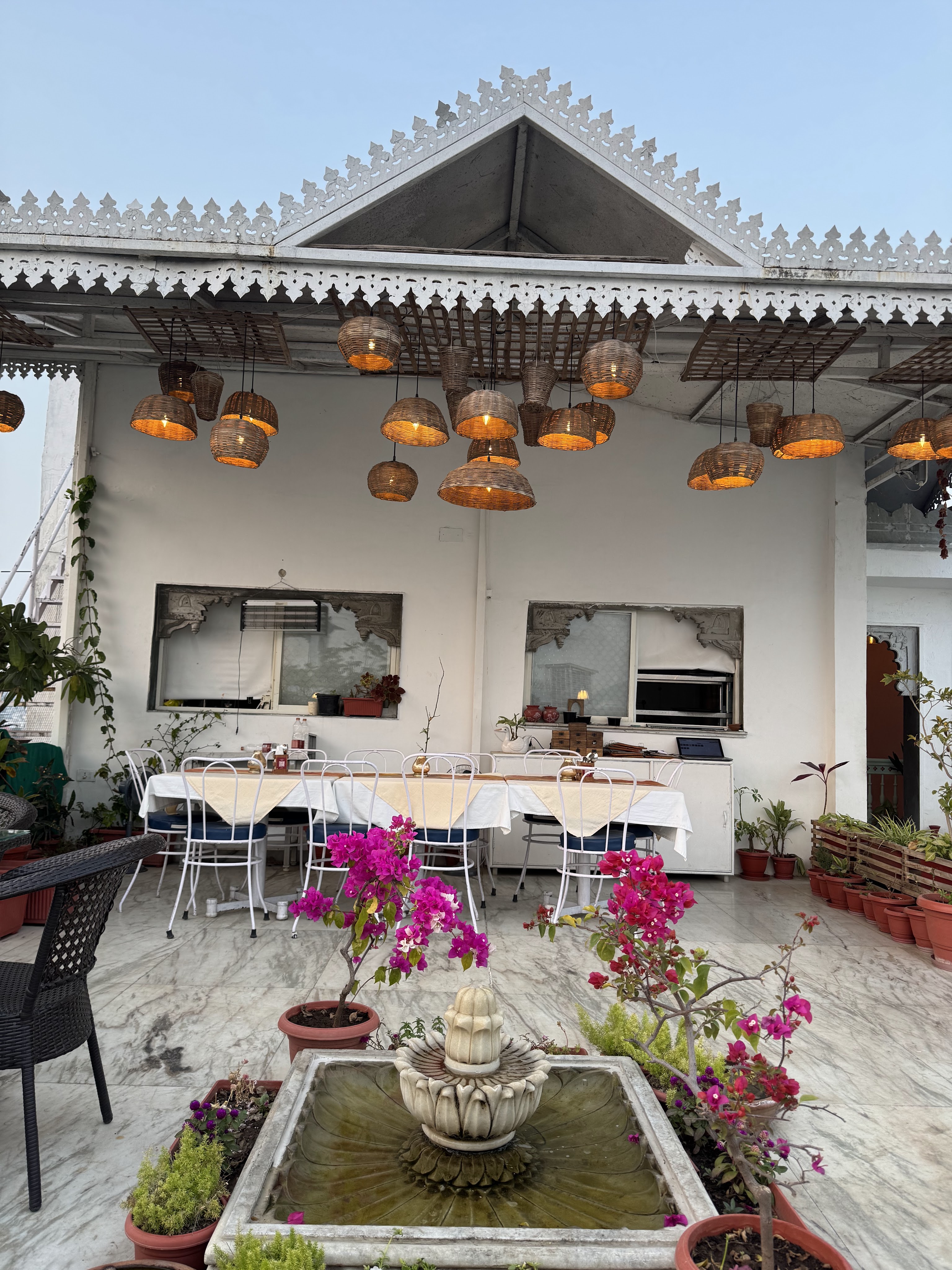 Modern fusion food restaurant in the heart of the old town with expansive views of Lake Pichola. We ordered the Jeeravan chicken popcorn, kra pao samosa, Nyoto tawa pulao (my favorite bite), Thai omlette, filter coffee mille feuille, and fresh lime soda. The rosette chaat is another popular dish.